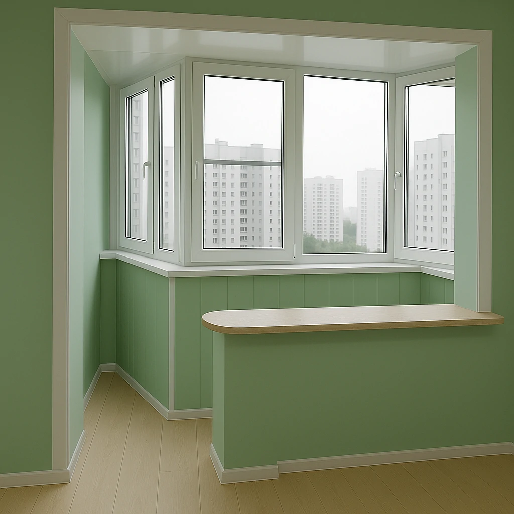 Лоджия «Каблучок» полностью преобразилась: холодное алюминиевое остекление заменено на тёплые окна Veka с двухкамерными стеклопакетами. Выполнено утепление всех поверхностей, стены и потолок отделаны панелями МДФ. На полу — ламинат с подложкой. Встроенный шкаф и рабочая поверхность из ЛДСП делают пространство функциональным для хранения и работы. Лоджия готова к круглогодичному использованию.